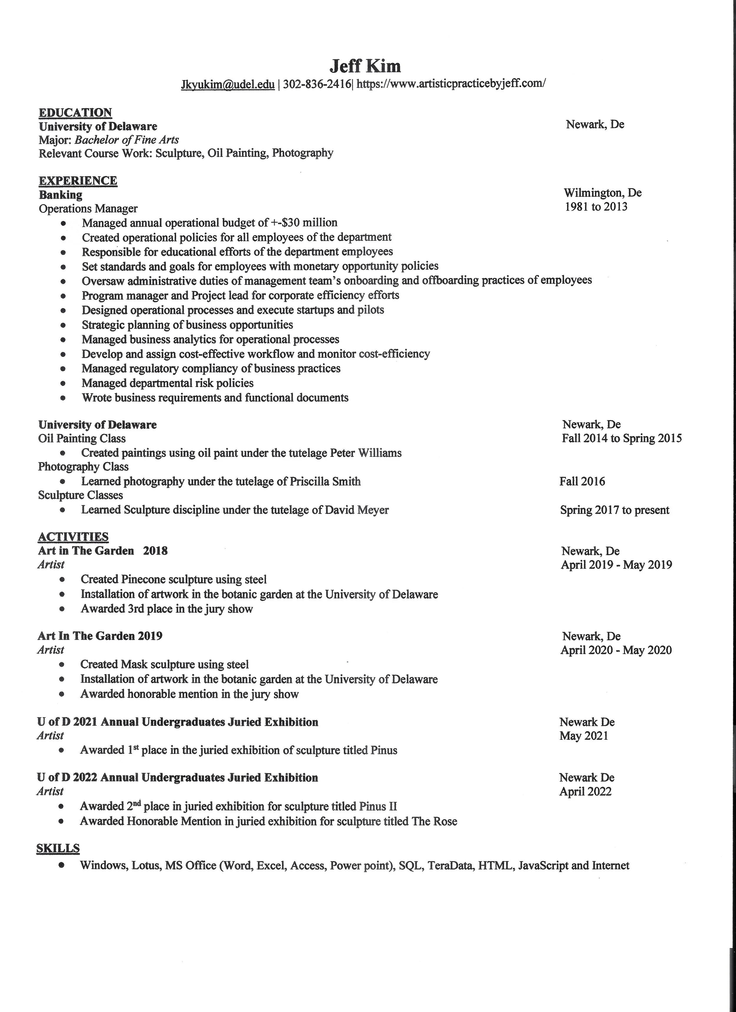 Jeff stated taking classes at the University of Delaware after he retired from the financial sector. He never thought about pursuing an art degree. He began taking a oil painting class to pick up a hobby.