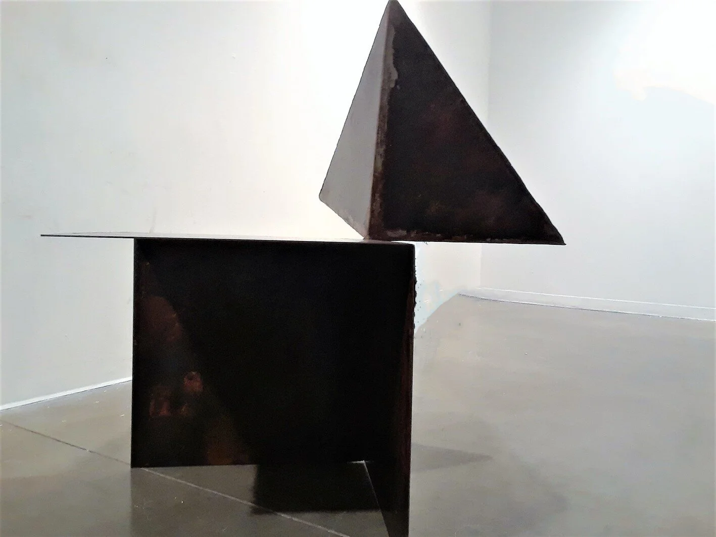 Art is the illusion of creating an image that defy logic, a wonderful way of telling incredible lies. The Illusions of Art is my lie that defies logic visually. The creation of gravity defying sensation of a geometric object with one end held up in the air that provides the sense of illusion that the one end is floating. The texture of the steel also gives the illusion that the piece is made of marble when seen from an specific angle.